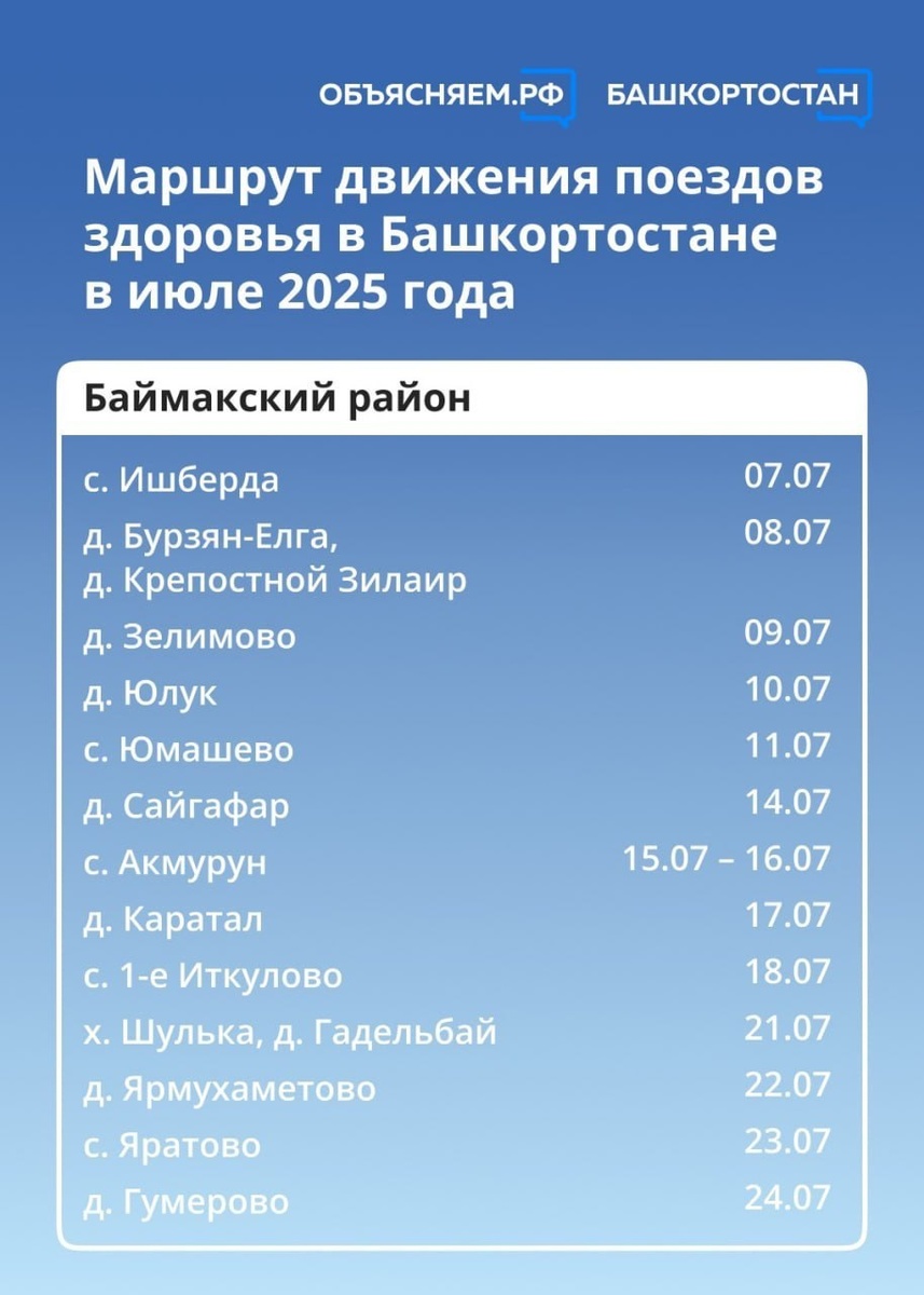 ❗Стал известен маршрут «Поезда здоровья» в Баймакском районе. В пресс-службе минздрава РБ напомнили, что обследование проводится бесплатно. Записываться к специалистам не нужно — приём проводится в порядке живой очереди. Главное, взять с собой паспорт и полис ОМС.
