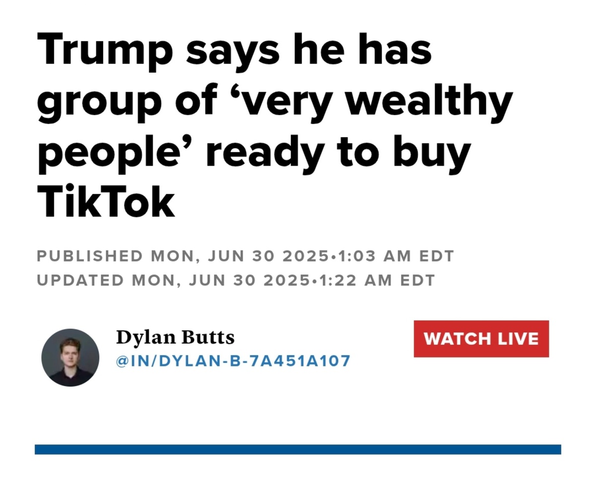 Дональд Трамп наконец нашёл "очень состоятельных людей", готовых приобрести американскую версию TikTok. Имена потенциальных покупателей он обещал раскрыть в течение двух недель. Сделка должна получить одобрение Си Цзиньпина, и Трамп уверен, что это согласие будет получено. На данный момент установленный срок для продажи TikTok истекает 17 сентября, после чего приложение может быть заблокировано.