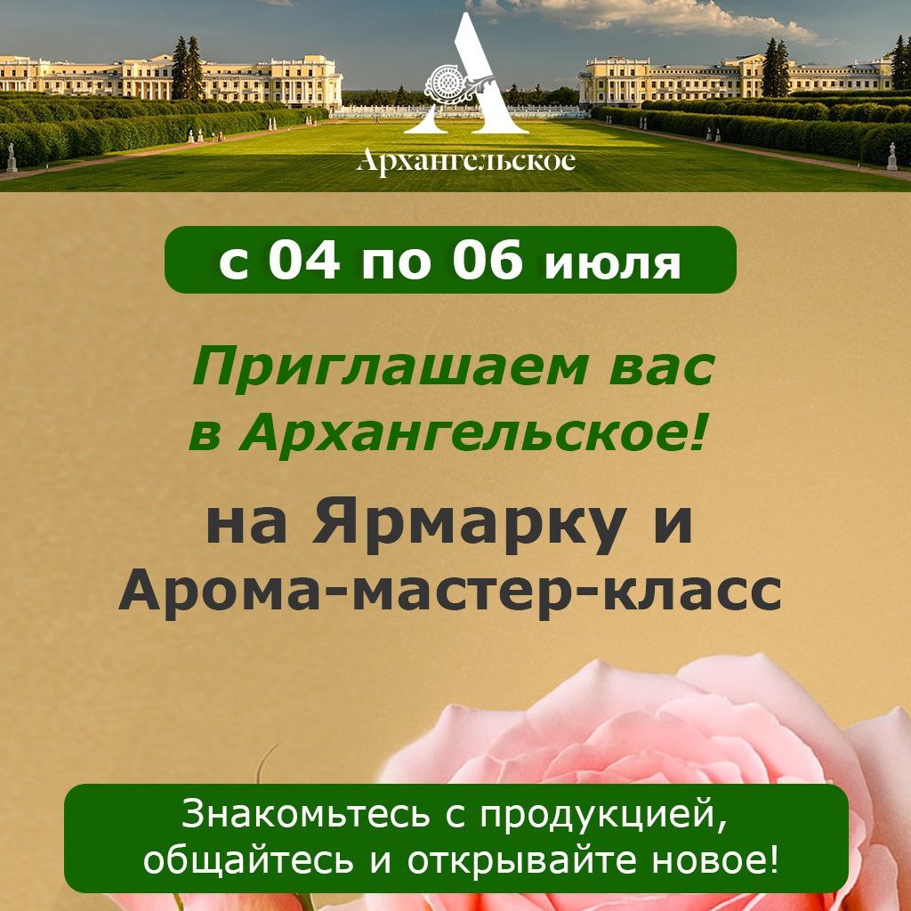 🌸🌸🌸🌸🌸🌸🌸🌸🌸 🌸🌸🌸 и ботанических затей в Архангельском ПРИГЛАШАЕМ ВАС В АРХАНГЕЛЬСКОЕ НА ЯРМАРКУ И АРОМА - МАСТЕР - КЛАСС 💌 А также приглашаем вас на мастер-класс по ароматерапии в Архангельском – уютное событие, наполненное волшебством ароматов Роз! 📅 6 июля (воскресенье) 15.00 – 17.00 2 часа теплого и полезного общения 🌹 Что вас ждёт? Арома–мастер–класс: Вместе с экспертом от компании Арнебия вы познакомитесь с силой эфирных масел, научитесь создавать свои «ароматические комплексы» – расслабляющие соли для ванн и ингаляций. Вы узнаете, как запахи помогают справиться со стрессом, улучшить концентрацию или просто подарить себе мгновения умиротворения. И, конечно, познакомитесь с разными ароматами розы с точки зрения ароматерапии. 🌹 Почему стоит прийти? Погрузитесь в атмосферу уюта и заботы о себе Создадите свои уникальные ароматы для поддержки души и тела Унесете с собой флакончик с арома солью. 🌹 РАСПИСАНИЕ ПРОГРАММЫ ОТКРЫТИЯ ФЕСТИВАЛЯ 💌 Ждём вас с нетерпени
