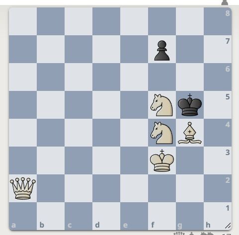Очередная шахматная задача. У черных только пешка, у белых три легких фигуры и ферзь. Ход белых мат в 2 хода. Автор задачи Е. Богданов, 2001 год. Видеоролики теперь публикую тут, просьба подписаться на канал. Первый верный ход смотрите в галерее. Более мощная задача тут