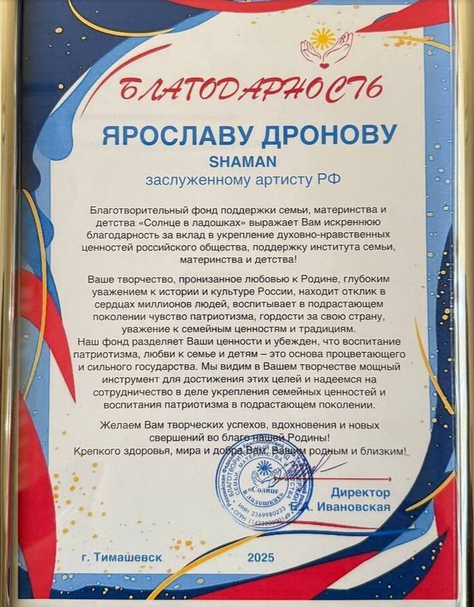 Перепечатка статьи с канала "Таня - Лайф". Без изменений. Благодарность - это, конечно, не медаль, но тоже похвала. И очередная благодарность Ярослава Дронова, полученная им в 2025 году от благотворительного фонда поддержки семьи, материнства и детства г. Тимашевска почему-то широко не афишировалась. Ну дали и дали. Листок бумаги по своей сути, хоть и в рамочке. Это же не награда Народного артиста и не медаль за заслуги трёх степеней. То ли дело благодарственное письмо от самого Президента. Тогда сам SHAMAN похвалился и выложил его на своем телеграм-канале. А вот новость про похвалу за вклад в укрепление духовно- нравственных ценностей российского общества как-то быстро промелькнула и забылась. Вдумайтесь только: За уважение к семейным ценностям и традициям. Наверное директор фонда Ивановская мало знакома с ранним и, тем более, поздним творчеством SHAMAN'а, иначе бы у нее дрогнула рука, подписывая этот документ. О каком уважении к семейным ценностях может идти речь у дважды разведенног