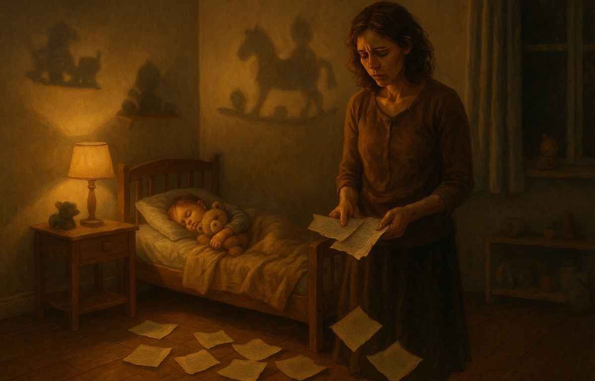 Холодный свет ночника превращает детскую в театр теней. На стене пляшут силуэты игрушек — невинные днем, сейчас они кажутся свидетелями семейной драмы. Анна вдыхает запах детского шампуня, смешанный с горечью собственных слез.