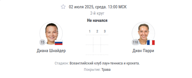 🌦️ Погода: Умеренная облачность, +24°C Шнайдер — безоговорочный фаворит благодаря классу, опыту и адаптации к траве. Парри способна навязать борьбу только при сбое россиянки: Прогноз: Победа Шнайдер 2:0 (6:3, 6:4) при тотале геймов 19–22. Парри покажет упорство в концовке второго сета, но мощь ударов №15 мира станет решающей. Для Дианы этот матч — шаг к потенциальному четвертьфиналу против Жасмин Паолини. Прогнозы на этот матч и другие вы можете посмотреть в нашем Телеграмм канале: Ace Bet: Прогнозы на теннис