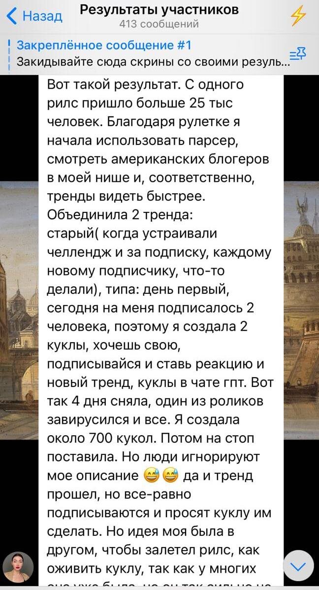 Парсер как читерство. Которое все игнорируют. Делюсь недавним кейсом: 27к подписок с одного ролика. Но дело не в цифрах. Дело в том, как она это сделала. Взяла парсер. Нашла два работающих тренда у американцев. И просто... совместила их. Старый челлендж (делаю куклу за каждого подписчика) + новый тренд (куклы через ChatGPT). 4 дня снимала в таком формате. Один ролик очень сильно залетел. 700 кукол пришлось делать... Теперь самое интересное. Она не изобретала велосипед. Не сидела с блокнотом, выдумывая "креативные идеи". Просто открыла парсер. Увидела что работает. Адаптировала под себя. Как взломщик сейфов, который не подбирает код методом тыка... ...а просто знает комбинации от всех сейфов в округе. Пока остальные творчески мучаются, она уже снимает по проверенным форматам. И получает результат. Вот в чём проблема большинства: Они думают, что парсер — это "копирование". Типа стыдно, не по-честному. А на самом деле это просто инструмент анализа. Как микроскоп для врача