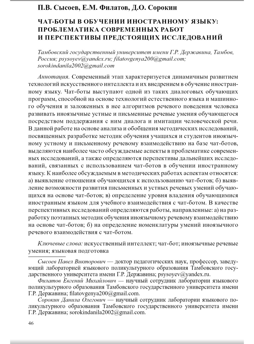 Возможно, имелась в виду работа П. В. Сысоева и Е. М. Филатова «Методика развития иноязычных речевых умений студентов на основе практики с чат-ботом» (журнал «Перспективы науки и образования», 2023).