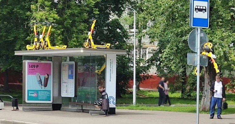Этим утром неизвестные жители района затащили четыре самоката на крышу автобусной остановки и еще парочку повесили на ветку рядом стоящего дерева. Между прочим, для этого надо обладать, мягко говоря, недюжинной физической силой, ну или использовать спецтехнику, поскольку весят прокатные самокаты немало — от 18 до 20 кг. Снимать их оттуда еще сложнее.