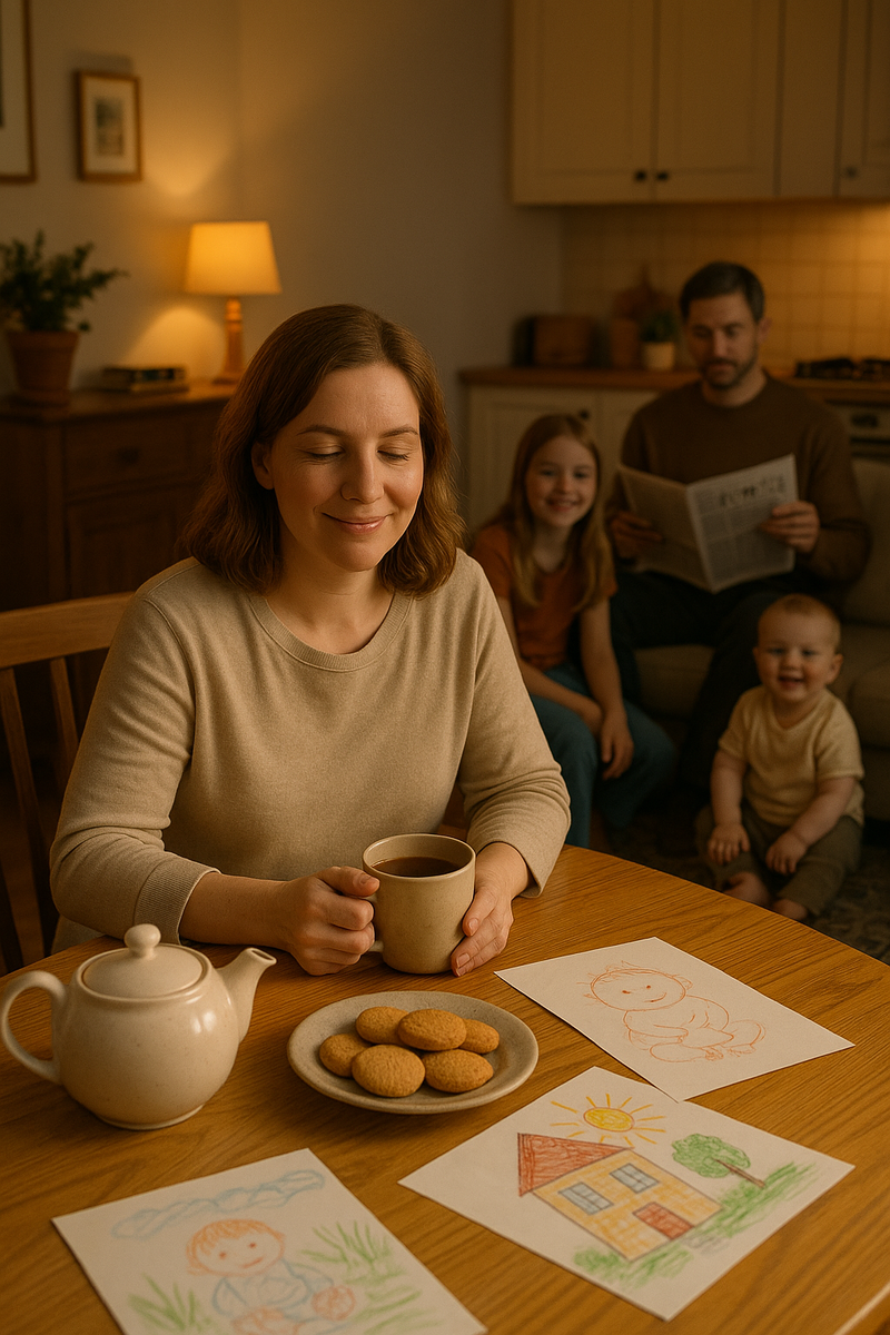 И вот я сижу вечером в своей уютной кухне. На столе чайник, печенье, детские рисунки. Где-то в комнате смеются дети. Муж шуршит газетой, готовится ко сну. И я понимаю — вот моя жизнь. Простая, тёплая, настоящая. И она мне по душе.
