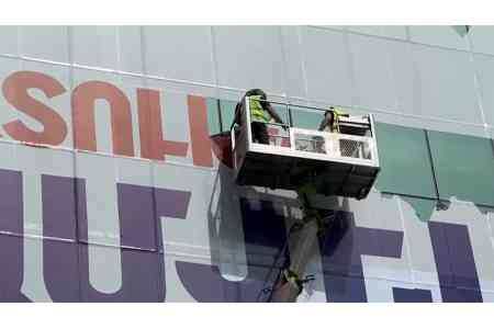 Мэрия Еревана демонтирует баннеры с надписью "Свободу Самвелу Карапетяну!" со здания ТЦ Далма