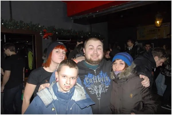 Однажды, на каком-то концерте, мы с Любой Траш(красные волосы и в шапке) сидели на мерче на выходе около гардероба клуба Точка. И вот эта пара молодых ребят с фотографии приехала из Подмосковья на концерт. Они стеснялись что-то купить и заговорить с нами, потому что думали, что мы иностранцы, а языка они не знали. Но Люба, обладающая великолепными навыками общения, всё просекла и мы поболтали, и сфоткались с ними. Ребята были милейшие.