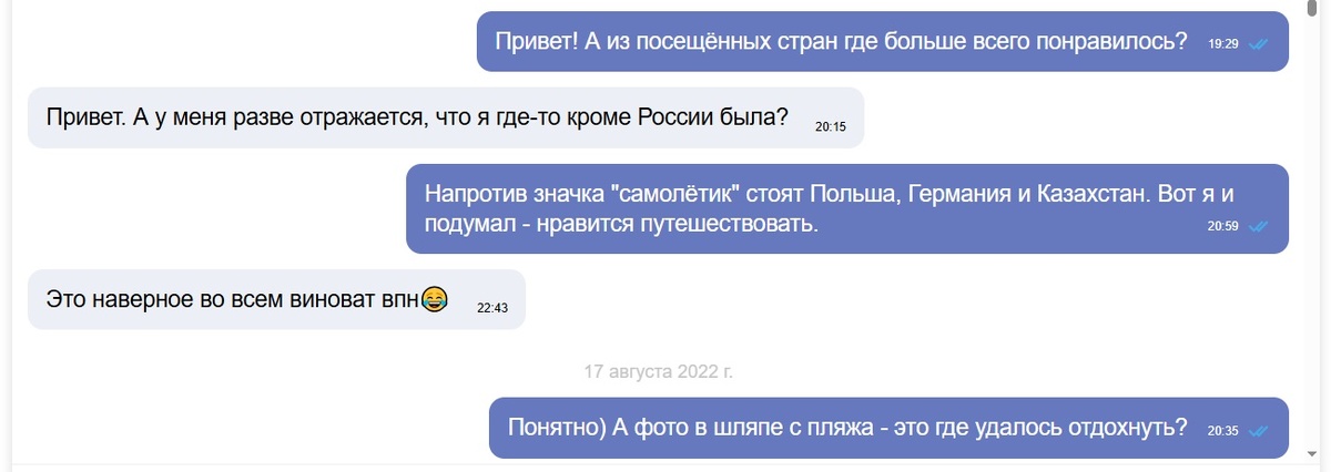 Всем доброго времени суток. В прошлой статье я делал анонс, что готовлю для читателей статью с единственной, но достаточно длинной перепиской. Переписка, можно сказать, достаточно давняя - я просто последовательно иду, публикуя переписки от наиболее старых до новых. И если раньше я еще мог вести относительно длинную беседу на сайте знакомств, то теперь стараюсь ограничивать общение примерно 10-12 сообщениями в сумме (по 5-6 сообщений с каждой стороны) - и при условии нормальной переписки стараюсь выводить собеседницу в реал. Длинное общение без перспективы занимают слишком много времени и сил. Обычный анонс для тех, кто, возможно, читает статью с переписками в первый раз: Переписки специально выкладываю без каких-либо указаний на личность собеседницы, чтобы никого нельзя было персонифицировать. На скриншотах те реплики, которые белыми буквами на фиолетовом фоне - это мои слова. Если под репликой две галочки не закрашены голубым - значит собеседник не видел и не прочитал сообщение. Пер