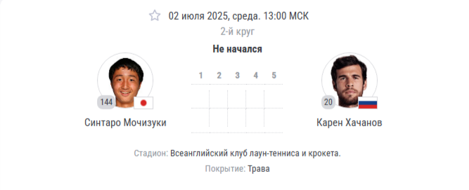 Ключевой фактор: Более 25 невынужденных ошибок от Хачанова. - Сенсация (победа Мочизуки): <5% — возможна только при травме Хачанова или его тотальном психологическом сбое.