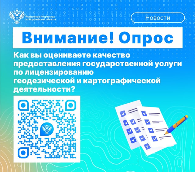 Уважаемые заявители! Управление Росреестра по Воронежской области приглашает вас принять участие в опросе об удовлетворенности качеством предоставления государственной услуги по лицензированию геодезической и картографической деятельности. Пройти опрос можно: • На платформе обратной связи «Общественное голосование» портала Госуслуг «Мой выбор, мое будущее» или по ссылке: https://pos.gosuslugi.ru/lkp/polls/528236/.