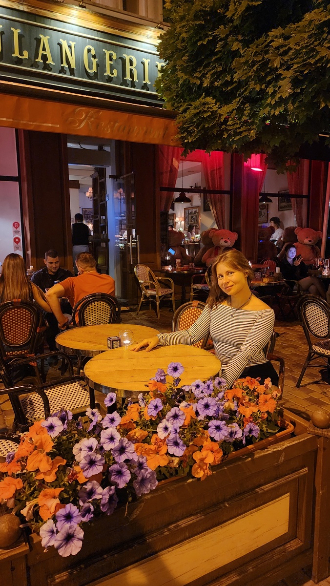 Я сегодня не случайно в тельняшке - мы в ресторане с французским уклоном Boulangeri в Симферополе. В этом заведении не впервые, люблю его. В этот раз попали в сезон летних террас. Ресторан этот очень популярен - в понедельник в 9 вечера было всего пару свободных столов. Публика тут такая, я бы сказала, себя уважающая. Официанты приятные, видно, работа по стандартам обслуживания хорошо ведется. До Симферополя в этот раз добирались из Ростова долго - 11 часов, 2,5 часа в пробке перед мостом. На ужине уже хотелось расслабиться. Заказали напитки, а тут такое - пива нет. Не завезли. За выходные все выпили. Смогли предложить бутылочное вишневое, не Колин вкус, на фото заметно его разочарование. Хочу отметить, что официант настолько искренне сочувствовал, рассказывая ситуацию с пивом, что только за это уже готовы были оставить чаевые :) Мне же вино понравилось. Выбирала из этого меню, с органической винодельни. Вот выдержка из меню с сайта ресторана. Из кухни заказывали тальятелле с мореп