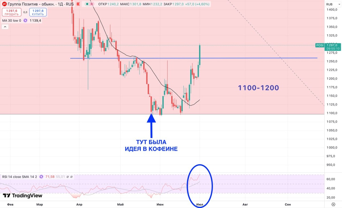 Позитив пробил важный уровень (синяя линия), закрепившись выше которого, можно будет говорить о переломе нисходящей тенденции 🤞 Писал ещё 7 февраля о целях похода в район 1100-1200 🎯 Цели были спрогнозированы через совмещение фундаметального и технического анализа. И бумага точно дошла до 1100 👌 На 1100 было нарисовано классическое двойное дно и вот теперь возникла надежда на долгосрочный рост 🤞 На этом же уровне была дана идея в кофеине, которая в плюсе уже на 17.5% c 26 мая ☕️ Идея в $POSI на уровне 1105 от 26 мая Второй пост по идее в $POSI от 07 июня Помните, кофеин помогает принимать решения, но не делает это за вас 😉
