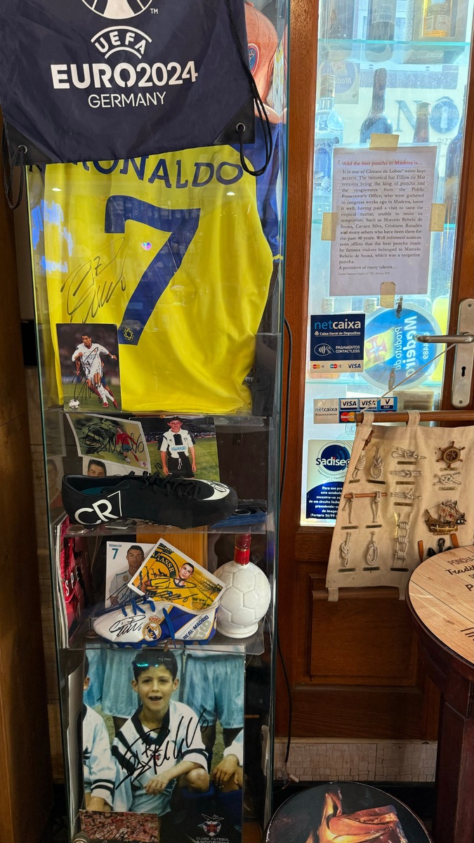 «Ваша цель посещения Мадейры?» Моя цель № 1 — бар дяди Роналду. Однажды сёрфинг в интернете привёл меня к информации, что в маленькой рыбацкой деревеньке Камара-ди-Лобуш есть небольшой бар с традиционными напитками Мадейры. Напитки называются понча и никита. Попробовать на Мадейре их можно в любом баре, НО... Держит этот бар дядя Криштиану Роналду #CR7. Информации было очень мало. Но тем интереснее этот вызов! Барчик совсем маленький, но количество экспонатов на единицу площади зашкаливает. Это футболки с автографами всех клубов, где Криш играл, фото, мячи, бутсы, в общем, отвал башки! Это ли не музей! Поговаривают, местных внутрь не особо пускают. Не знаю, был момент, когда я в баре была наедине с дядей) Не успела я, только войдя внутрь, сфоткать бутылку традиционной местной мадеры с фото любимчика, как получила дегустационный шот) О, это чувство, когда тебе наливает дядя Криштиану! И это даже не теория шести рукопожатий) Это был второй случай, когда я прослезилась на Мадейре. У всех