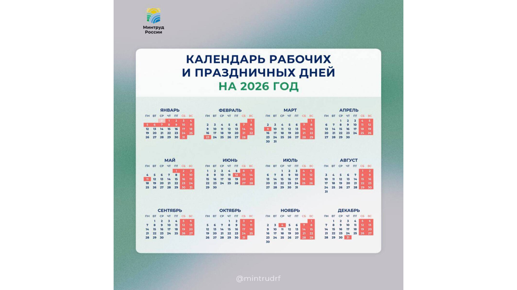 В 2026 году в нашей стране ожидает ряд продолжительных выходных, включая 12-дневные новогодние каникулы. Министерство труда и социальной защиты РФ представило проект календаря выходных дней. Итак, предполагаются следующие периоды отдыха: Новогодние каникулы: с последнего дня 2025 года по 11 января 2026 года. Февраль: трёхдневные выходные подряд – с 21 по 23 февраля. Март: также три выходных дня – с 7 по 9 марта. Май: дважды по три выходных дня – с 1 по 3 мая и с 9 по 11 мая. Июнь: снова выходные с пятницы по воскресенье – с 12 по 14 июня. Ноябрь: один выходной день в середине недели – 4 ноября (среда). Начало новогодних праздников 2027 года: старт 31 декабря. Глава Минтруда России Антон Котяков рассказал, что ежегодно правительство принимает решение о переносе выходных дней, которые совпадают с праздничными датами. Эта мера направлена на создание более удобного графика работы и отдыха для граждан, а также на объединение праздничных и нерабочих дней. Как жители Брянской области будут от