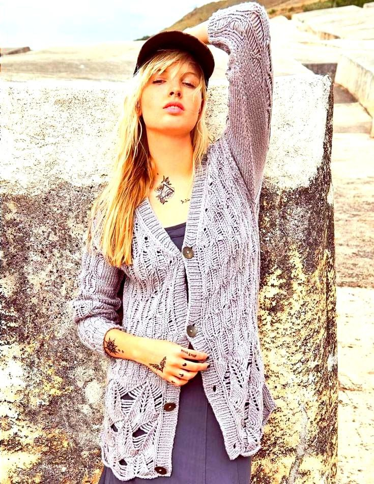 Оригинальный дизайн этого вязаного жакета создан благодаря причудливому узору из петель, которые образуют то крупные, то мелкие отверстия в вязаном полотне.