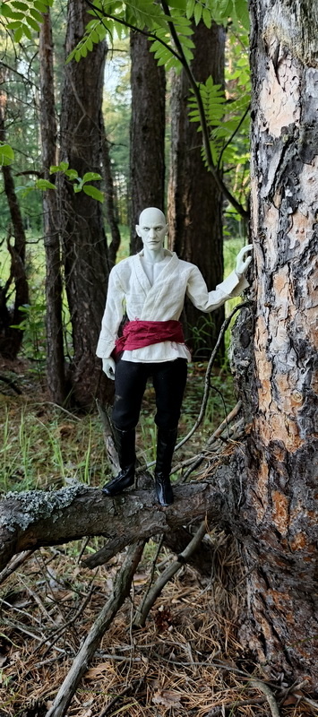 Как я уже писала ранее, в этот раз на дачу выехал и Рух, но так как я растяпа, то остался мой домашний вурдалак без плаща, который я бережно погладила и... оставила лежать красиво расправленным на диване. "А что подумал по этому поводу Кролик Рух, никто так и не узнал, потому что Кролик Рух был очень воспитанный." Из-за неловкости с Ильей и Валери перед воспитанным и галантным вурдалаком встал вопрос: скрасить время прекрасной дамы - а в этом он настолько хорош, что дамы визжат от восторга, иф ю ноу вот я мин - или же таки проявить солидарность со своим же лучшем другом в моей коллекции. Поглядев на Валери, Рух озабоченно уточнил: "Это вот ОНА похожа на твою бывшую? Дружище, у тебя были очень непростые годы. Щас мы возьмем чего-нибудь горяченького и ты мне все расскажешь". Конечно с самой Валери он был предельно галантен и улыбчив, но, как понятно из его монолога, впечатления девушка на него не произвела. На улице было жарковато, поэтому щеголял в простой рубахе. Когда я стащила с н