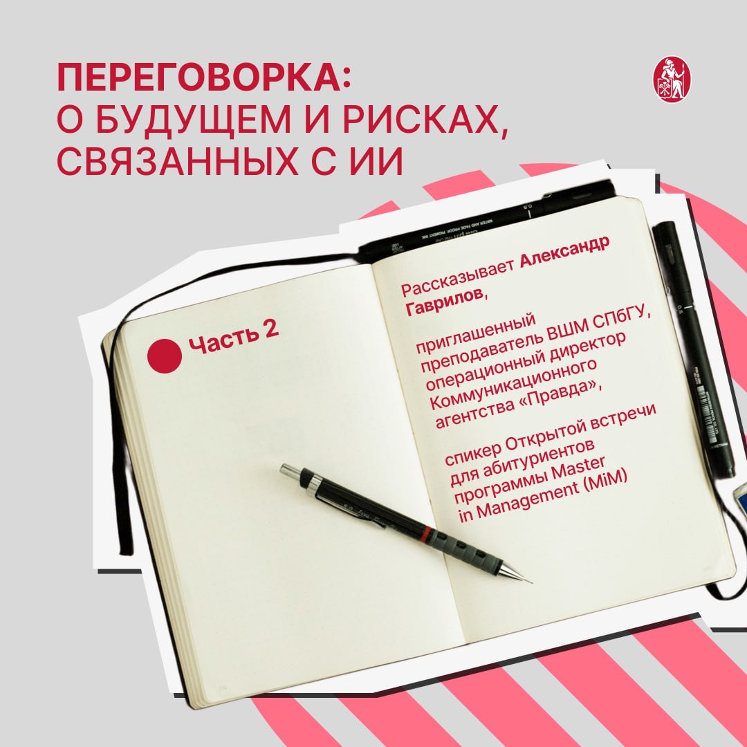 📌 Креатив vs ИИ: что останется людям в эпоху искусственного интеллекта? Приглашенный преподаватель ВШМ СПбГУ Александр Гаврилов, операционный директор коммуникационного агентства «Правда», анализирует будущее креативных индустрий в новом цифровом мире. 📢 Продолжаем рубрику «Переговорка» и сегодня разберём вопросы: 🔸 Какие сферы креатива ИИ не освоит даже через 10 лет? 🔸 Как изменятся креативные агентства? 🔸 Может ли ИИ создавать тренды? 🔸 Чего действительно стоит бояться? Уже завтра Александр Гаврилов выступит спикером на Открытой встрече для абитуриентов программы Master in Management (MiM) — регистрируйтесь и приходите, чтобы узнать больше о поступлении на программу и послушать эксперта в digital-маркетинге и PR! 📆 Когда: 2 июля в 17:00 📍 Где: Волховском пер., 3, ауд. 204