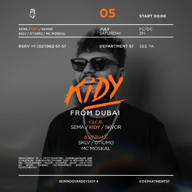 SATURDAY / 5 JULY — KIDY (Dubai) в Department 57 Музыкальный директор Secret Room Dubai, резидент FIVE Palm, Gallery 7/40 и тех, кто звучит уверенно. Его треки — в Beatport Top 100, его эфиры — в прайм-тайм Pure Radio Dubai, его сеты — на сценах Expo 2020, Dubai Opera, Untold Festival и даже New York Fashion Week. KIDY не просто ставит музыку — он runs your vibe. Department 57. Global sound, local precision. 🎫 Вход свободный Резерв: +7(921)962-57-57 21+ FC/DC 📆 5 июля, пре-пати с 18:00, танцы с 00:00 📍 Department 57, Санкт-Петербург, Конногвардейский б-р 4