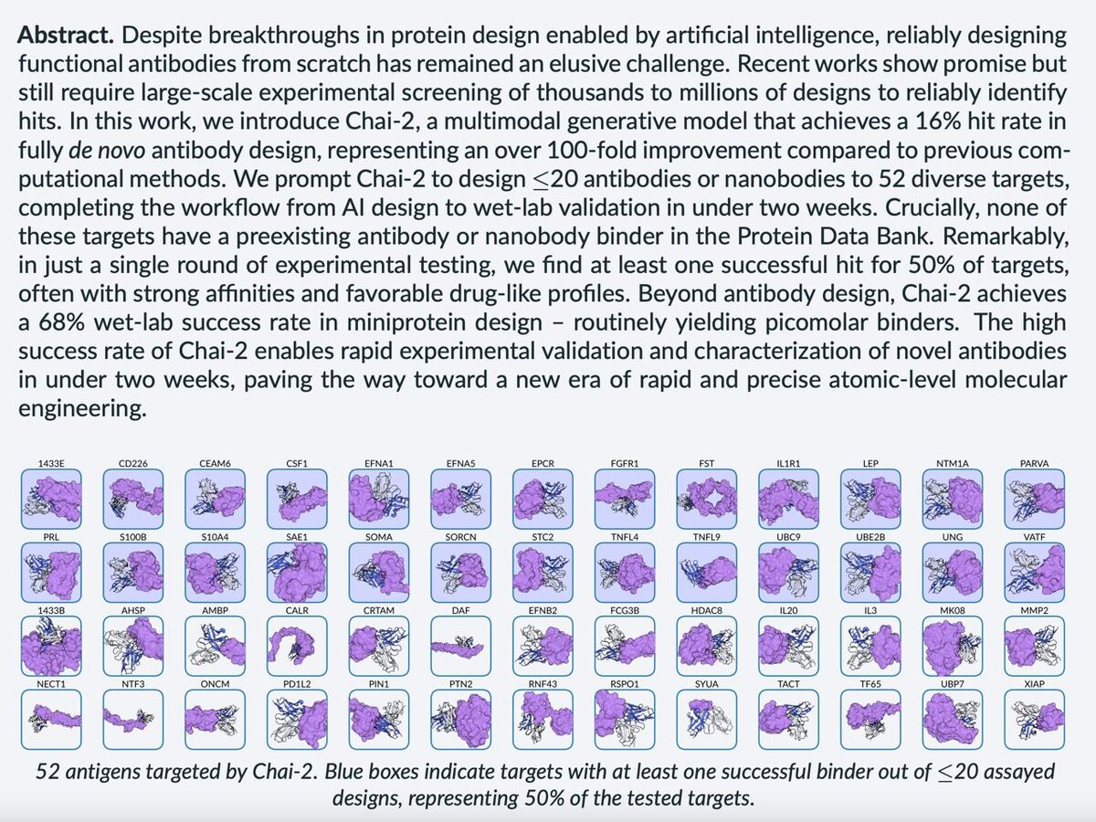 🧬 Chai‑2: новая эра в генеративном дизайне антител с помощью ИИ Несмотря на прогресс в проектировании белков, создать рабочие антитела с нуля до сих пор было почти невозможно. Но новая модель Chai‑2 менянт правила игры. Chai‑2 — это мультимодальная генеративная модель, которая впервые позволяет проектировать функциональные антитела de novo ( в биологии и биоинформатике означает создание чего-либо с полного нуля, без использования готовых шаблонов или существующих структур.) с высокой точностью. 📊 Результаты: • 16% антител показали нужную биологическую активность при генерации с нуля — это в 100+ раз лучше, чем у предыдущих методов (аньше hit-rate был <0.1%) • Создано ≤20 антител для 52 уникальных целей (это разные белки, молекулы или структуры, к которым ИИ должен был спроектировать подходящие антитела) • Найдены активные антитела для 50% целей — всего за один цикл лабораторного тестирования • Из 100 спроектированных минибелков 68 реально работали, как задумано, в лабораторных те