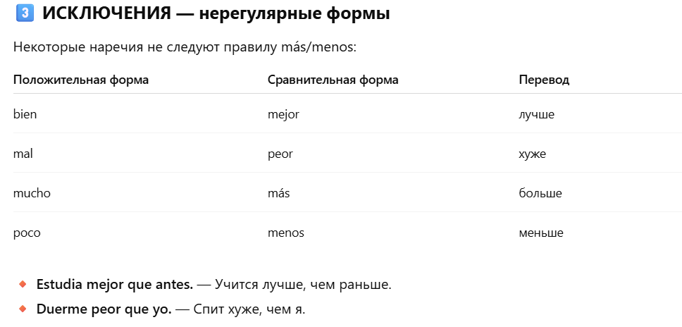 Не самая простая тема, но постараюсь объяснить ее простым языком с использованием различных примеров Превосходную степень наречий, которая делится на; Как она у нас создается? Если мы хотим сравнить одно с другим и сказать , что одно больше/ выше/ быстрее/ и так далее -чем что то другое мы можем сказать по следующей схеме сначала говорим: (означает больше или более) дальше добавляем какое то наречие и закрываем все это и получается Vengo al trabajo más temprano que tú - я прихожу на работу раньше тебя если мы хотим сравнить и сказать что что-то меньше медленнее ниже и тому подобное то у нас следующая схема Lo hago menos rápido que tú - я это делаю медленнее чем ты оно означает такой, такая, такие, такое же. Venimos tan tarde como ellos - мы приходим так же поздно как и они у нас есть наречие bien- хорошо которая в сравнительной степени будет mejor-лучше мы не можем сказать mas bien мы должны будем говорить mejor Hablamos español mejor que ellos - мы говорим по-испански лучше чем