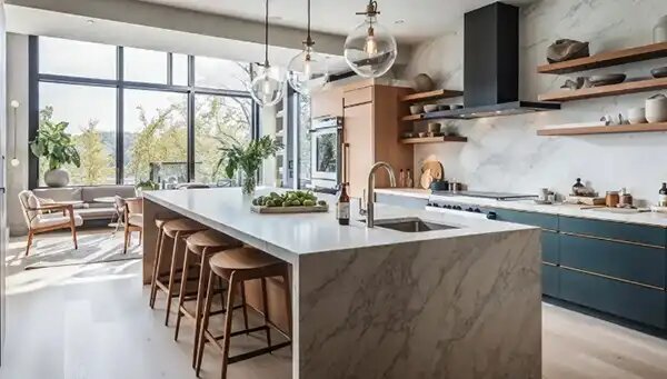 Мраморный водопадный остров источает роскошь и вечную элегантность. Идеально подходит для тех, кто хочет создать высококлассное кухонное пространство, он прекрасно сочетается как с классическим, так и с современным декором. Используйте его для контраста с темными шкафами или для улучшения полностью белой кухни для чистого, изысканного вида. Просто не забывайте регулярно покрывать мрамор герметиком, чтобы поддерживать его первозданное состояние.