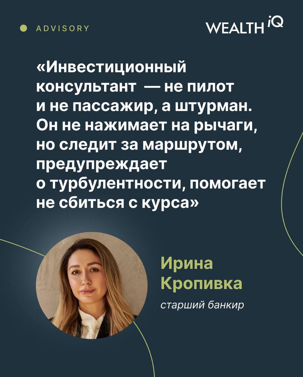 «Такая модель может давать около 3% дополнительной доходности» — как работает инвестиционное консультирование. Заметки банкира 💬Ирина Кропивка, старший банкир Два с половиной года назад нашу компанию зарегистрировали в едином реестре инвестиционных советников. С тех пор в списке появилось еще полсотни человек и организаций. Мы с коллегами часто рассказываем в канале про инвестиции, но мало — про сам формат инвестиционного консультирования. А ведь он новый (по меркам российского рынка) и при этом куда честнее других, особенно если консультант — не банк, брокер или УК, а компания без дополнительных лицензий. Когда человек приходит за инвестиционным консультированием в банк или к брокеру, он чаще всего хочет одного: чтобы ему помогли сохранить и приумножить свой капитал (сейчас чаще говорят именно про сохранить — по крайней мере мои клиенты). Но инвестсоветник в банке зарабатывает на продаже конкретных продуктов и ценных бумаг, и у него есть KPI. Как бы вы ни были симпатичны менеджер