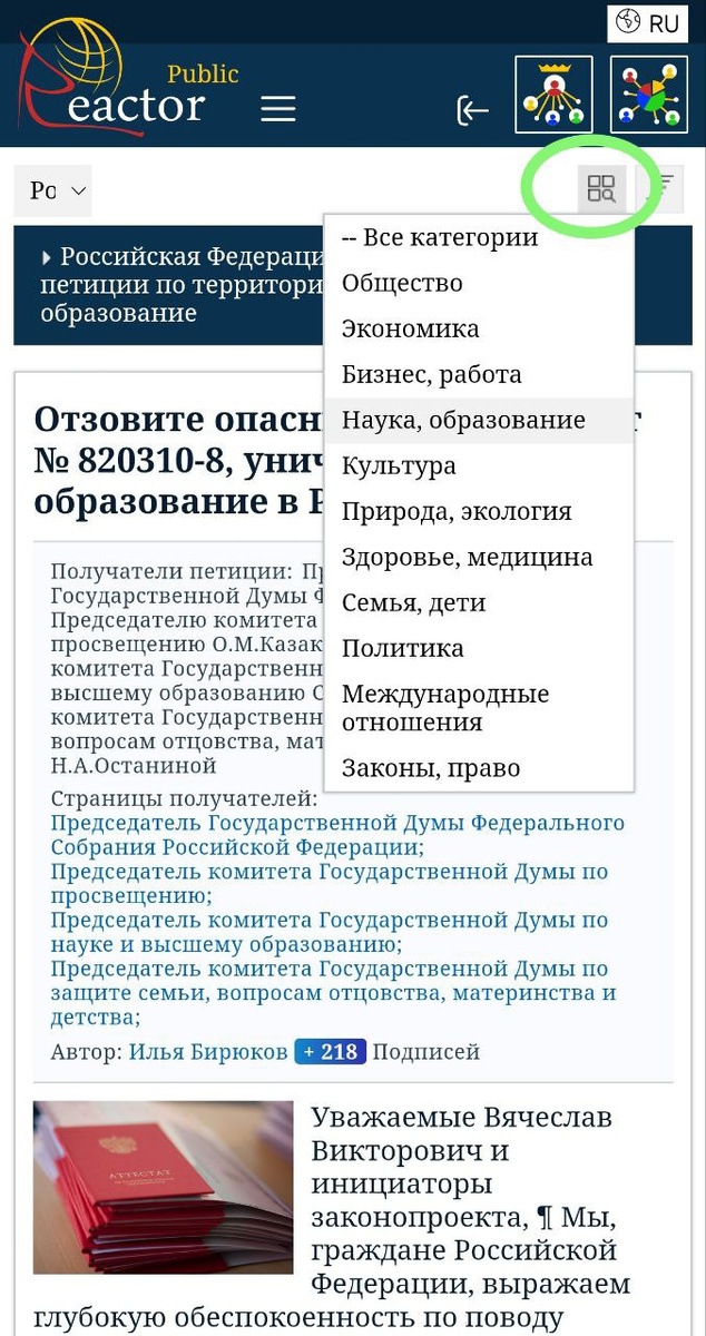 На портале Reactor пользователи поднимают самые разные темы — от городских проблем до федеральной повестки. Все петиции и статьи распределены по категориям, среди которых: – Общество – Экономика – Бизнес, работа – Технологии – Наука, образование – Культура – Спорт – Природа, экология – Здоровье, медицина – Семья, дети – Политика – Международные отношения – Законы, право – Вооруженные силы 🔹 Тема образования регулярно звучит на страницах портала. В информационном пространстве активно обсуждается законопроект №918255-8 О внешней оценке качества образования. Многие высказывают свои точки зрения по этому законопроекту и ряду других. Reactor — полноценная платформа для обсуждений. 🔹 Чтобы найти все материалы по интересующей теме: 1. Перейдите в раздел Петиции или Статьи. 2. В правом верхнем углу нажмите значок категории. 3. Выберите категорию. Следите за темами, которые вам важны. Участвуйте в обсуждениях! 🌐 r-r.site #образование #обсуждения #статьи #законопроект #госдума