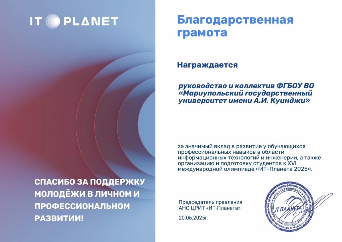 ΠΠ»Π°Π³ΠΎΠ΄Π°ΡΠ½ΠΎΡΡΡ ΠΏΠΎΠ»ΡΡΠ΅Π½Π° Π·Π° Π·Π½Π°ΡΠΈΠΌΡΠΉ Π²ΠΊΠ»Π°Π΄ Π² ΡΠ°Π·Π²ΠΈΡΠΈΠ΅ Ρ ΠΎΠ±ΡΡΠ°ΡΡΠΈΡ ΡΡ ΠΏΡΠΎΡΠ΅ΡΡΠΈΠΎΠ½Π°Π»ΡΠ½ΡΡ Π½Π°Π²ΡΠΊΠΎΠ² Π² ΠΎΠ±Π»Π°ΡΡΠΈ ΠΈΠ½ΡΠΎΡΠΌΠ°ΡΠΈΠΎΠ½Π½ΡΡ ΡΠ΅Ρ Π½ΠΎΠ»ΠΎΠ³ΠΈΠΉ ΠΈ ΠΈΠ½ΠΆΠ΅Π½Π΅ΡΠΈΠΈ, Π° ΡΠ°ΠΊΠΆΠ΅ Π·Π° ΠΎΡΠ³Π°Π½ΠΈΠ·Π°ΡΠΈΡ ΠΈ ΠΏΠΎΠ΄Π³ΠΎΡΠΎΠ²ΠΊΡ ΡΡΡΠ΄Π΅Π½ΡΠΎΠ² ΠΊ XVI ΠΠ΅ΠΆΠ΄ΡΠ½Π°ΡΠΎΠ΄Π½ΠΎΠΉ ΠΎΠ»ΠΈΠΌΠΏΠΈΠ°Π΄Π΅ Β«ΠΠ’-ΠΠ»Π°Π½Π΅ΡΠ° 2025Β».