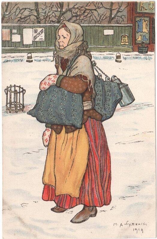 Так, давайте, что есть: рисунок прекрасного нашего Мстислава Валериановича Добужинского, с охтенкой. Отличается от той☝️, правда? А дело в том, что охтенки не были молочницами, с кувшинами они спешили многочисленными, а не с одним, аккуратненьким. Они работали скорее, как курьеры, и доставляли своим заказчикам свежее молоко с рынка, на Охте, в город, через речку.