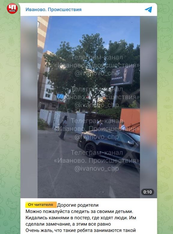 Прекрасный, тихий Иванов, обычная улица Жарова, и вдруг – молодые люди, которые с остервенением пытаются закидать камнями рекламный плакат с афишей концерта Шамана. Не просто граффити нарисовать, а именно камнями! Хотя серьёзного ущерба изображению артиста нанести не удалось, инцидент, согласитесь, более чем необычный.