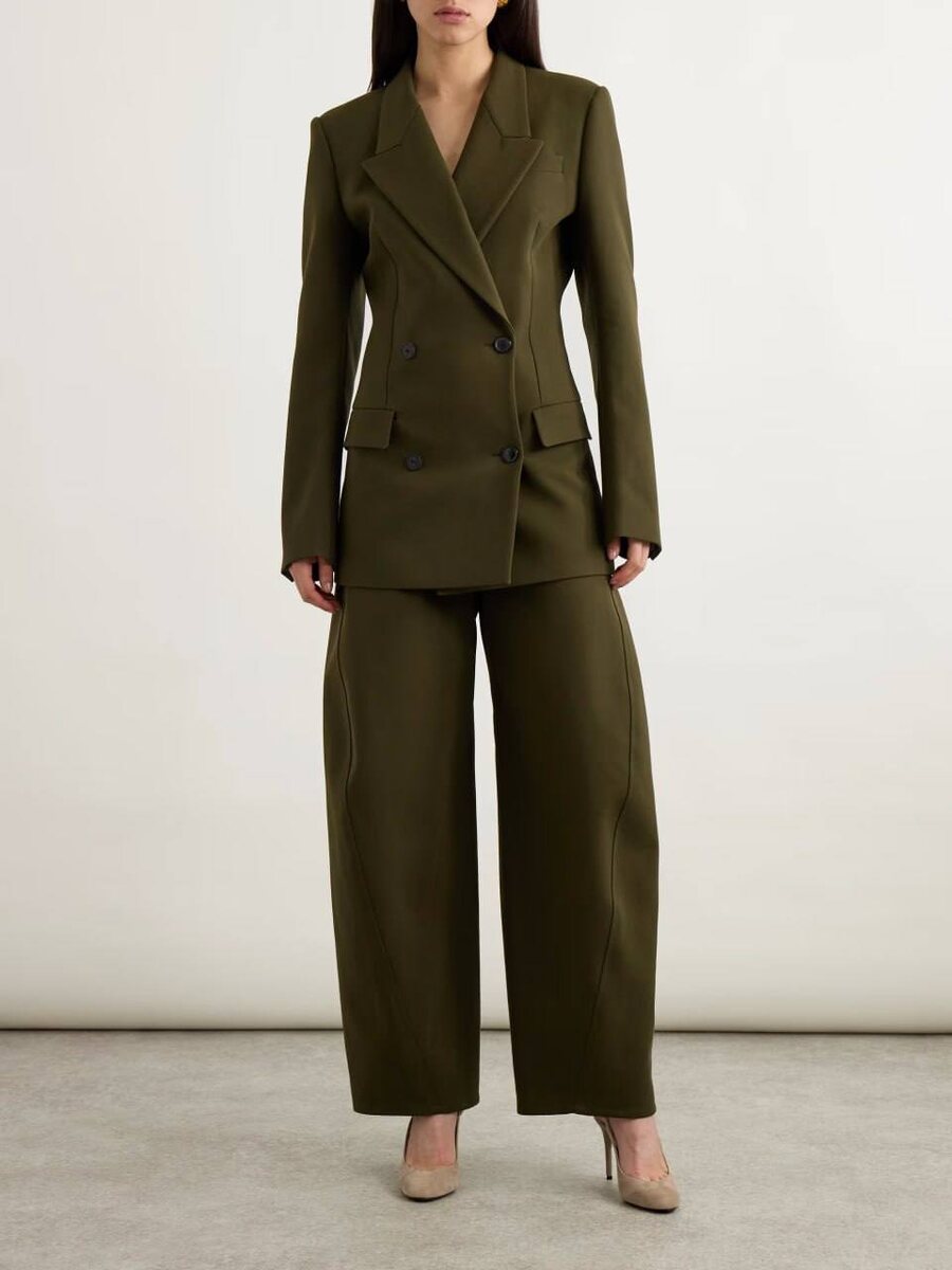 Плотная, мягкая, пластичная, красиво ложится в крупные складки. Держит форму, поэтому хорошо подойдёт на костюмы с объемными деталями.