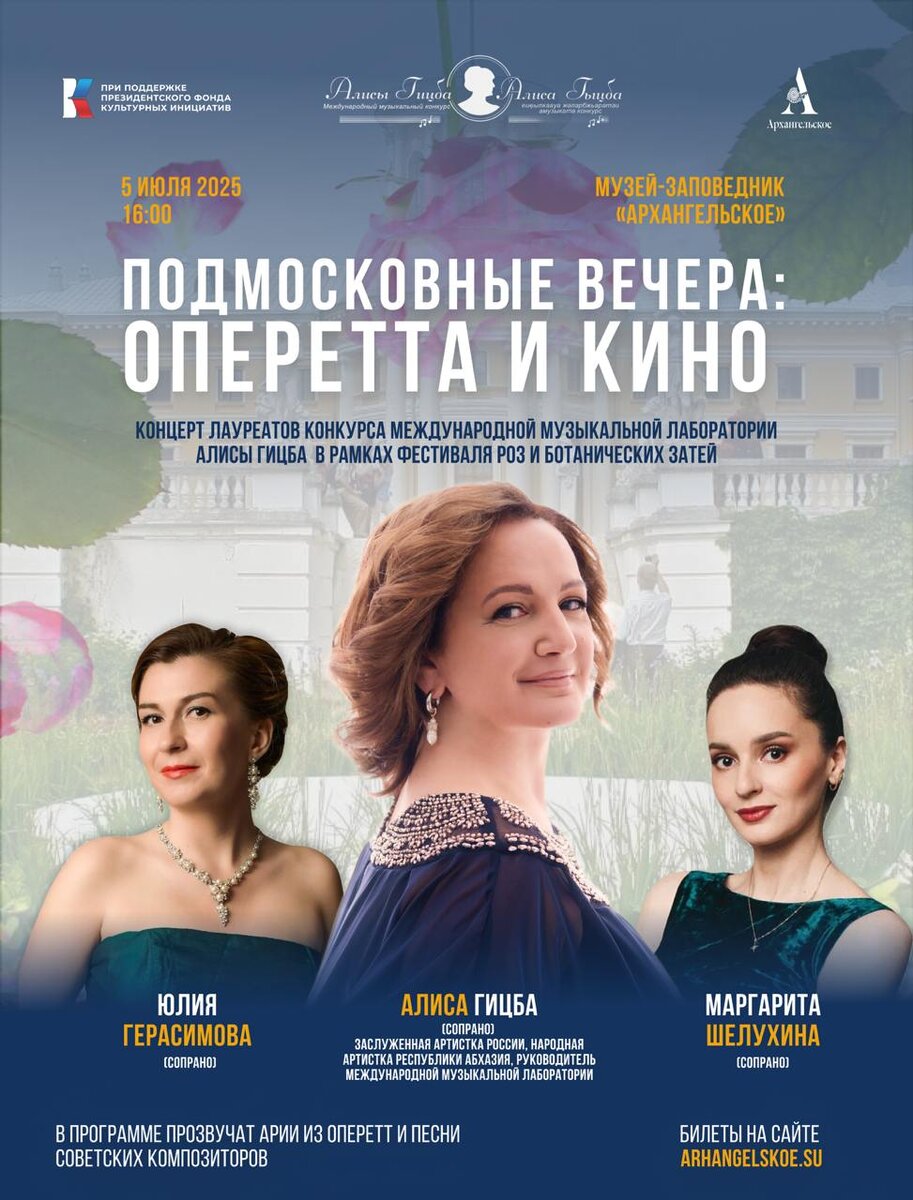 🎶Лето, цветы и музыка!🎶 5 июля 16:00 – пройдёт самый красивый концерт лауреатов конкурса Международной музыкальной лаборатории Алисы Гицба в саду музея-заповедника «Архангельское» – «Подмосковные вечера: Оперетта и кино». Есть несколько причин почему этот концерт удостоен звания самого красивого: ⁃ Он проходит в рамках Фестиваля роз и ботанических затей в саду музея-заповедника. Вокруг много цветов необычных растений, атмосфера красоты и эстетического удовольствия – обеспечены. ⁃ В гармонии с красотой растений, на открытой площадке в саду прозвучат голоса наших прекрасных сопрано: ⭐️Алисы Гицба – солистки Московского музыкального театра «Геликон-опера», народной артистки Абхазии, заслуженной артистки России, художественного руководителя Международной музыкальной лаборатории ⭐️Юлии Герасимовой – лауреата II премии Международной музыкальной лаборатории 2024 года. ⭐️Маргариты Шелухиной – лауреата III премии Международной музыкальной лаборатории 2024 года. ⁃ Наши артисты подготовили