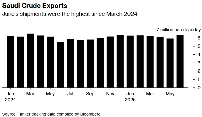 Саудовская Аравия экспортирует сырую нефть рекордными темпами за последний год В Саудовской Аравии наблюдается всплеск потребления нефти в летний период. В самые жаркие месяцы спрос на электроэнергию увеличивается, что приводит к росту потребления нефти почти на 600 000 баррелей в день. По данным Joint Organizations Data Initiative, Саудовская Аравия экспортирует сырую нефть рекордными темпами за последний год. Это связано с тем, что страна продолжает реализовывать стратегию по восстановлению своей доли на мировых рынках нефти. Согласно данным предварительного анализа данных отслеживания танкеров, собранных агентством Bloomberg, в этом месяце королевство увеличило экспорт сырой нефти на 441 000 баррелей в день, что составляет примерно 7%. Общий объём экспорта достиг 6,36 миллиона баррелей в день. Рост экспорта произошёл на фоне того, как альянс ОПЕК+ ускорил планы по восстановлению добычи нефти, что позволило потребителям получить облегчение. Это свидетельствует о том, что поставки чер