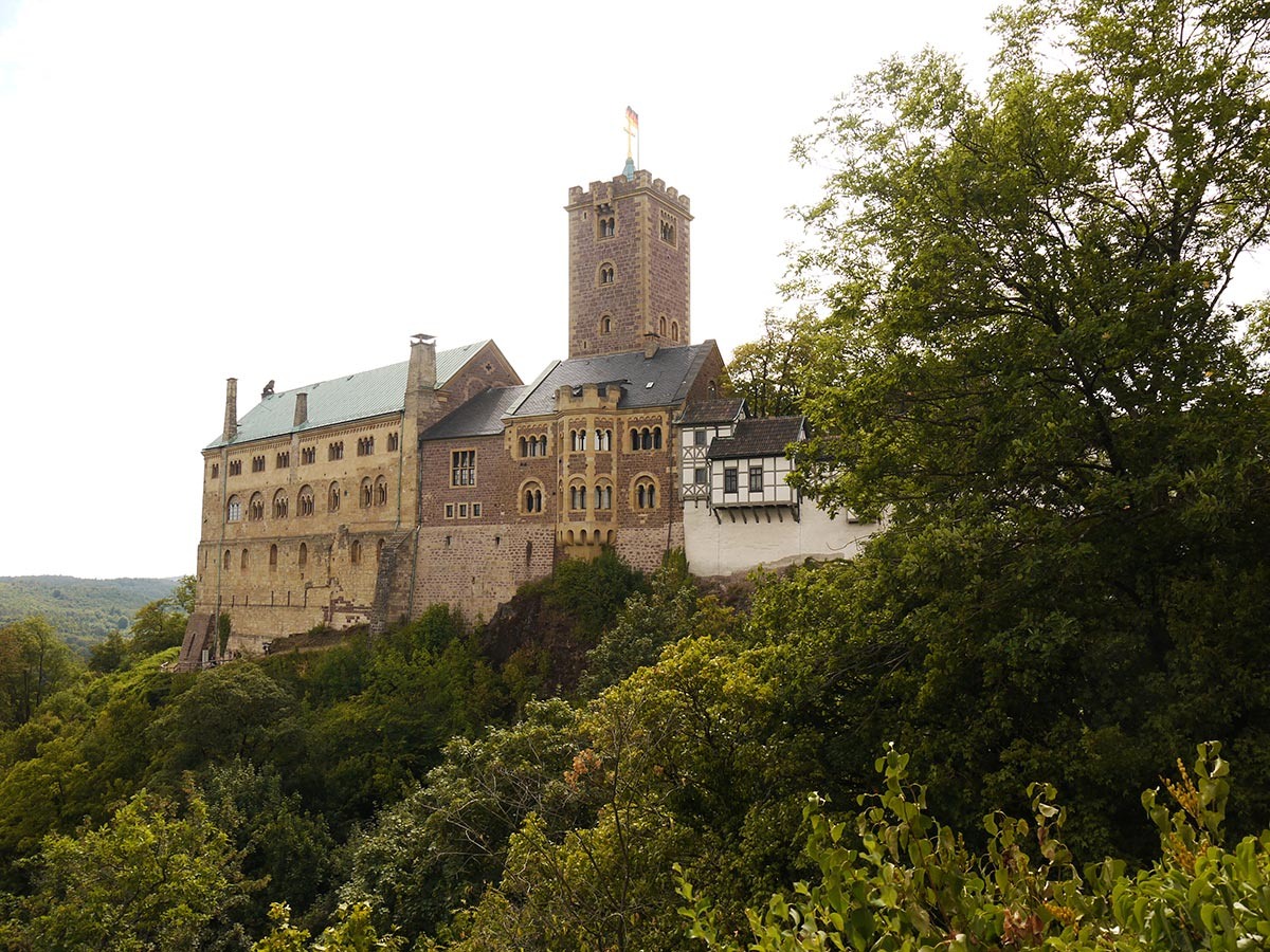 Замок Вартбург, пожалуй, один из самых известных и посещаемых замков Европы. Стоит этот средневековый град посреди густого тюрингского леса, на холме высотой 441 метр недалеко от города Айзенаха. Вартбург овеян славной историей и легендами. Здесь скрывался от преследования Мартин Лютер и здесь он сделал перевод Нового завета, известный, как Библия Лютера. Здесь проводились состязания певцов-миннезингеров (трубадуров), где по условиям конкурса которых певец, занявший последнее место, должен был умереть. Здесь впервые прозвучала идея объединения разрозненных земель в единое государство, а Гитлер проводил совещания астрологов и ясновидцев.