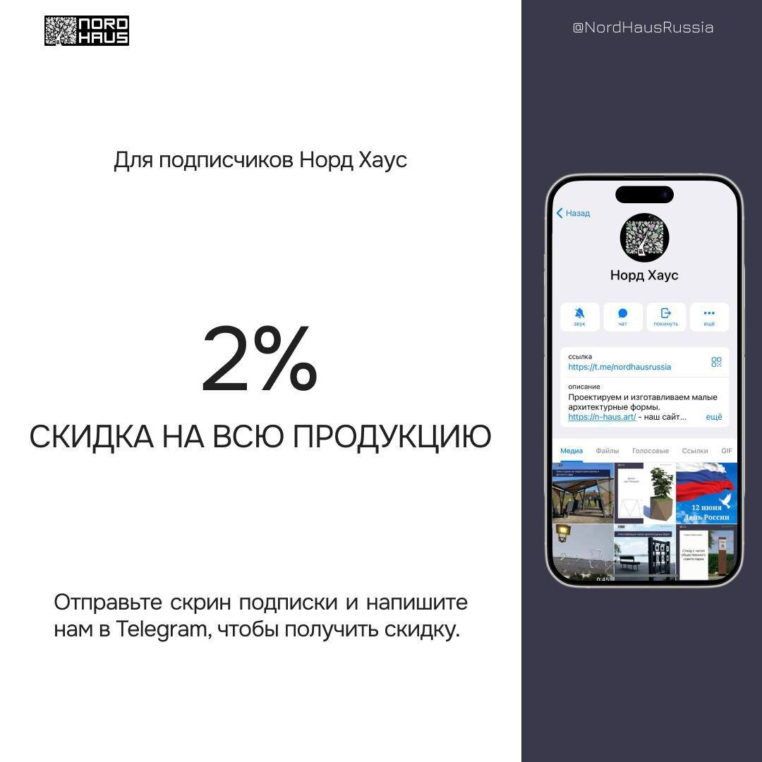 Специальное предложение для подписчиков канала Норд Хаус! Скидка 2% на всю продукцию Как получить? Делаете скрин подписки на наш канал ВК или Телеграм и отправляете удобным способ - в сообщения или на почту info@n-haus.art Рассказать про ассортимент продукции можем по 📞 8-495-150-4587