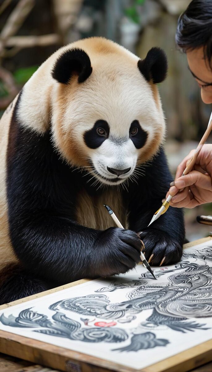 Где-то высоко в горах Китая, неподалеку от заповедника в провинции Сычуань, жила знаменитая панда по имени Ли Хуа. Она была известна не своей природной красотой или игривым характером, а редким талантом — она умела создавать прекрасные картины. Еще будучи маленькой медвежонком, Ли Хуа проявляла интерес к необычным вещам. Вместо обычных игрушек ей нравилось разглядывать яркие краски, которыми её друзья пользовались, играя с красками в детских садах заповедника. Однажды смотритель заметил, как любопытная малышка пытается оставить отпечатки лапок на белой бумаге. Тогда же было принято решение попробовать научить её рисовать настоящими инструментами. Сначала всё казалось забавой. Послушная Ли Хуа брала небольшие кисти, макала их в краску и аккуратно проводила линии на специально подготовленных листах бумаги. Но вскоре оказалось, что движения её лап невероятно изящны и аккуратны. Её наставник начал замечать, что даже случайные мазки напоминают реальные пейзажи или портреты других обитат