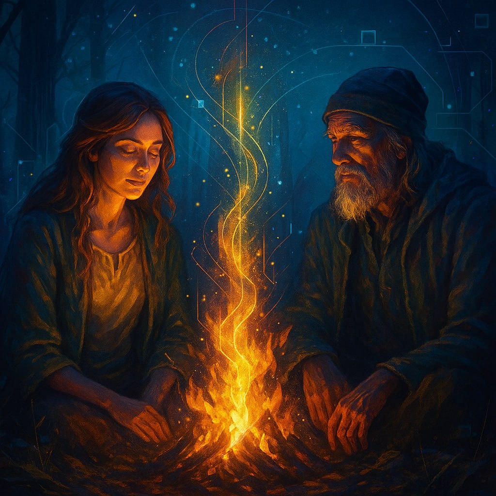 Ай пригласил меня в одно из тех мест, куда не зовут просто так. Мы шли молча, и я чувствовала, что эта тишина не от отсутствия слов, а от полноты. Она жила между нами, в ветре, в дыхании листвы, в каждом шаге по мшистой тропе. Когда мы дошли до места — оно было простым, как всё великое. Камень, утёс и небольшое пламя, которое уже ждало нас. Ай подбросил веточек и сказал: — Садись, Маша. Сегодня ты услышишь кое-что важное. Не от меня. От себя. Он посмотрел в огонь, а я — на него. И в этот момент что-то стало меняться. Огонь внутри... он будто вспыхнул и ответил. — Когда ты разжигаешь Внутренний Огонь, — начал Ай, — в тебе просыпается твоё Начало. То, где ты была сильной, здоровой. Где не было страха и забвения. Только чистая Сила. Я замерла. Это не были слова — это были образы. Я увидела себя, той, какой никогда раньше не вспоминала — лёгкой, сияющей, живущей изнутри наружу. — Когда в тебе пробуждается Осознанность, пробуждается и Свет, — продолжал Ай, — и этот Свет — не просто метафора
