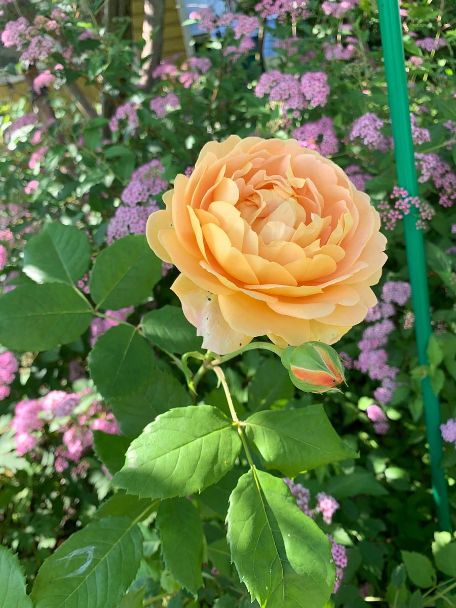 Роза Голден Селебрейшн, Д.Остин кустарниковая появилась у меня саду три года назад. Основные цветники на тот момент были заняты и ей досталось место в тени под яблоней. Как мы знаем, розы любят солнце и от этого зависит их рост и цветение. Я максимально стараюсь сдерживать соседние растения, которые могут мешать ей в росте. Цветок ярко-золотисто-желтый с медным оттенком, края внутренних лепестков загнуты внутрь цветка, шаровидный до чашевидного, махровый. Роза обладает насыщенным ароматом. Растение густое, компактное со слегка поникающими побегами. Лист темно-зеленый, крупный, полуглянцевый. У меня медленно растет эта розочка по причине места в тени. Но в этом году я довольна, что она набрала рост по сравнению с предыдущими годами и пышно цветет. Сорт Голден Селебрейшен был выведен Дэвидом Остином в 1992 году. Базой для создания сорта послужили роза мангового цвета Чарльз Остин (Charles Austin) и Абрахам Дерби (Abraham Darby) с ее удивительными персиково-розовыми цветками. Цвет