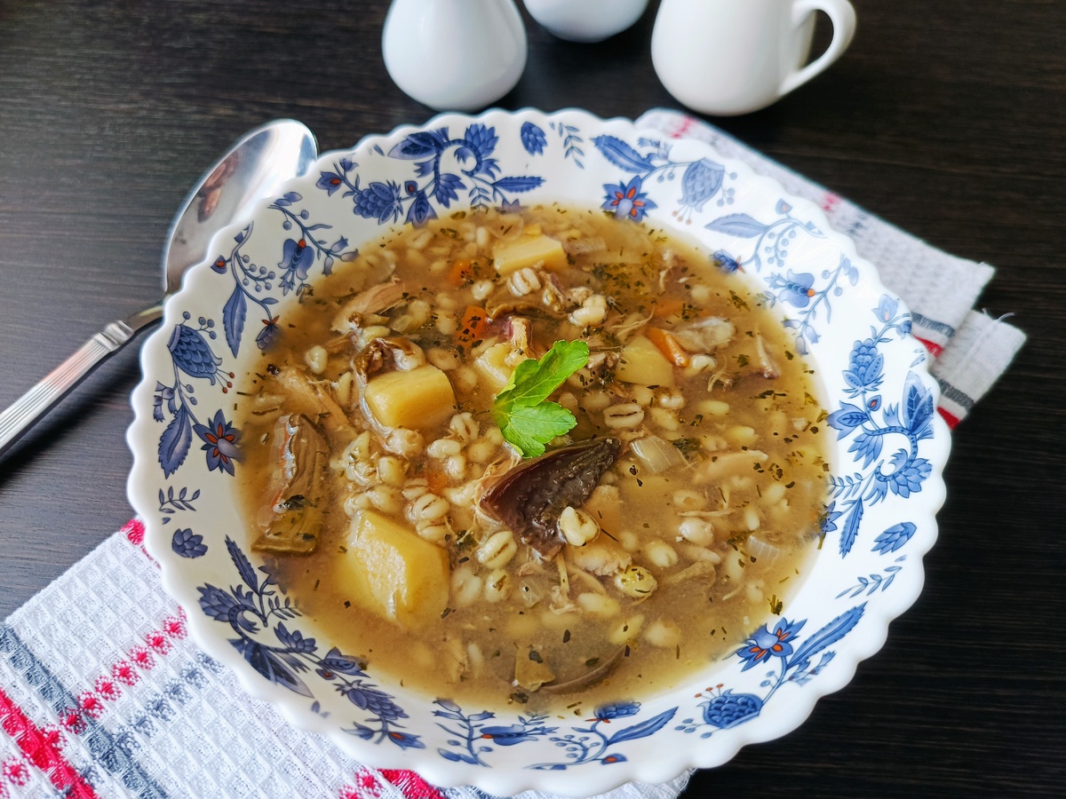 Сухие грибы просто взяла на глаз, чтобы было вкусно. Грибы я собирала и сушила сама. У меня два вида грибов — белые и моховики. Залить их небольшим количеством воды так, чтобы она покрыла их. Оставить, пока готовится суп. Грибной суп можно сварить на мясном бульоне или сделать его постным, чисто грибным, на воде. Я варила на курином бульоне. Перловку помыть. Если есть время, то можно оставить на час в воде, чтобы она быстрее сварилась. Хотя сейчас на производстве крупы обрабатывают, и они готовятся быстро. Обжарить лук и морковь до мягкости. В готовый бульон отправить перловку и варить почти до готовности на среднем огне. Перловка стала мягкой. Положить картофель, нарезанный кубиком. С картофелем добавить сухие грибы. Воду, в которой они замачивались, можно тоже вылить в бульон, только смотрите, чтобы на дне не было пес