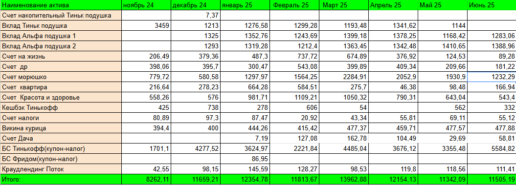- Во-вторых, "Вклад Тиньк подушка" был переоформлен на Финуслугах с начислением процентов в конце срока, так что какое-то время в этой ячейке будет пустота.