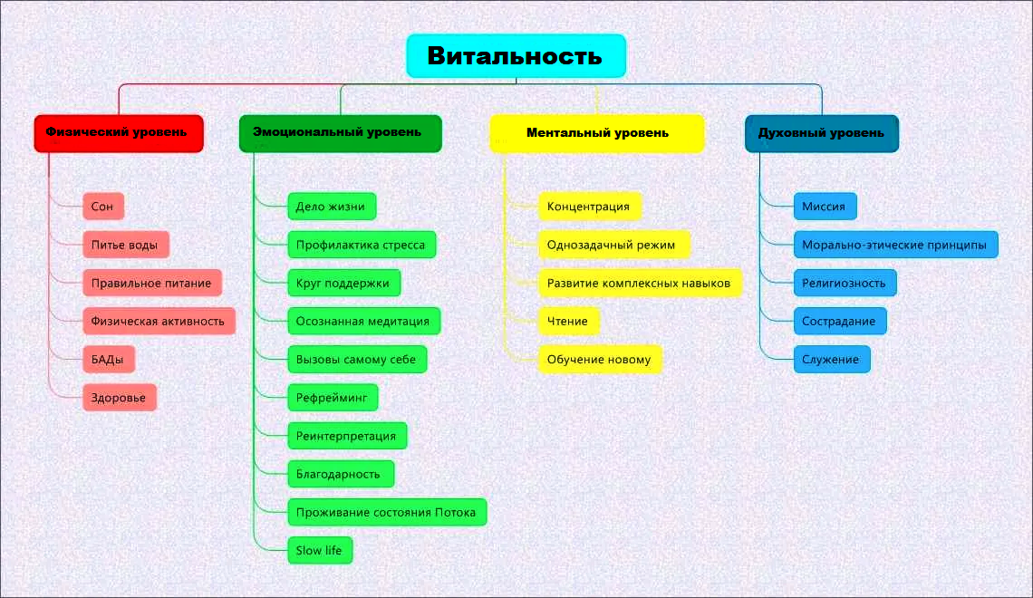 Витальность (от латинского vita — жизнь) — это жажда жизни, желание действовать и энергия для достижения целей. Понятие введено в психологию Р. Райаном и К. Фредериком в 1997 году. Некоторые признаки высокого уровня витальности: желание и способность действовать и двигаться вперёд, блеск в глазах, чувство лёгкости и расслабленности в теле, эмоциональный подъём, удовлетворение в душе и теле, радость от каждого прожитого момента, способность противостоять жизненным сложностям Витальность включает в себя несколько уровней: 1. Физический уровень. Энергия, необходимая телу для здоровья и работоспособности. Занимайтесь спортом. Но только тем, который вам действительно нравится. Например футбол и пешие прогулки. А есть ведь еще теннис, бег, плавание, велосипед. Спите ночью. Не менее 7 часов. Питайтесь правильно. Откажитесь алкоголя, кофе и других энергетических напитков, которые берут энергию из резервов организма и разрушают запасы. Не переедайте, на переваривание большого количества пищи у