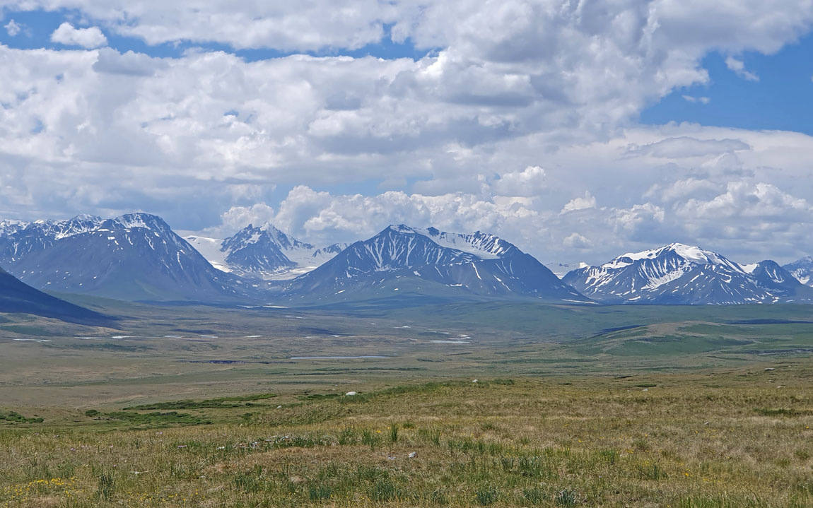 Где то там гора Канас (3440 м) и Пик Алахинский (3650 м), а между ними расположен перевал Канас, по которому проходит государственная граница между РФ и Китаем. Вид на хребет от озёр как на ладони. Граница рядом. Немножко позастревали) И начали движение на выход с Укока. В начале был план выйти через Бугумуюз. Но пограничник на первом посту мне сказал, что они недавно там были и для машин ещё рано этим маршрутом идти. Решаем выходить Тёплым ключом, но сначала попробовать пройти старым перевалом, выше Тёплого ключа.