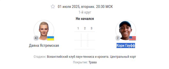 - Главная интрига: Противостояние свежей формы Ястремской (8 матчей на траве в июне) против звездного статуса Гауфф (победительницы Roland Garros).
