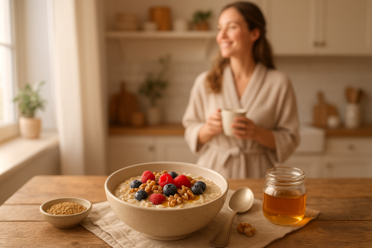 А вот на кухне — стеклянная баночка с орехами, бутылочка льняного масла, мёд, и в морозилке — запасы вишни. Завтрак стал чем-то вроде утреннего ритуала. Спокойного. Тёплого. О себе.