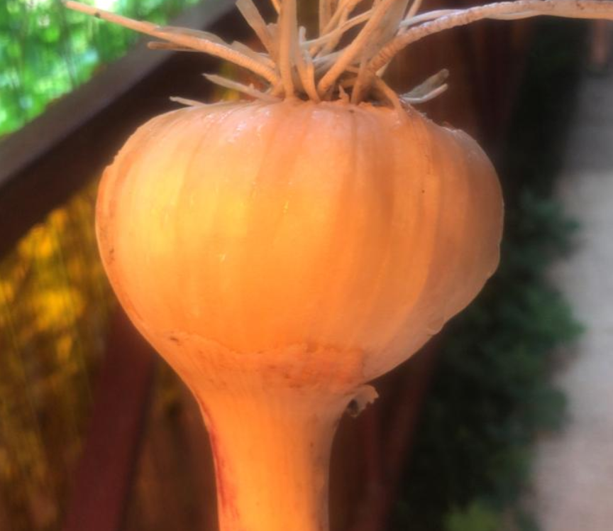 Единственное исключение - чеснок. У меня его много посажено, должно было на выходе быть 300 головок. И радовал он меня. Но дожди делают своё дело. Листья стали желтеть. А ведь сам чеснок обещал быть очень даже ничего. Вот этот на фото я выдернула, потому что все листья практически пожелтели, а он почти с кулак. Но ещё рано собирать, молодой..