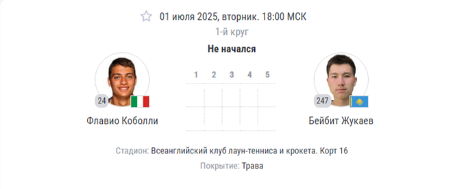 - Риски: Для Коболли — психология после разгрома от Фернли; для Жукаева — давление дебюта на Центральном корте.