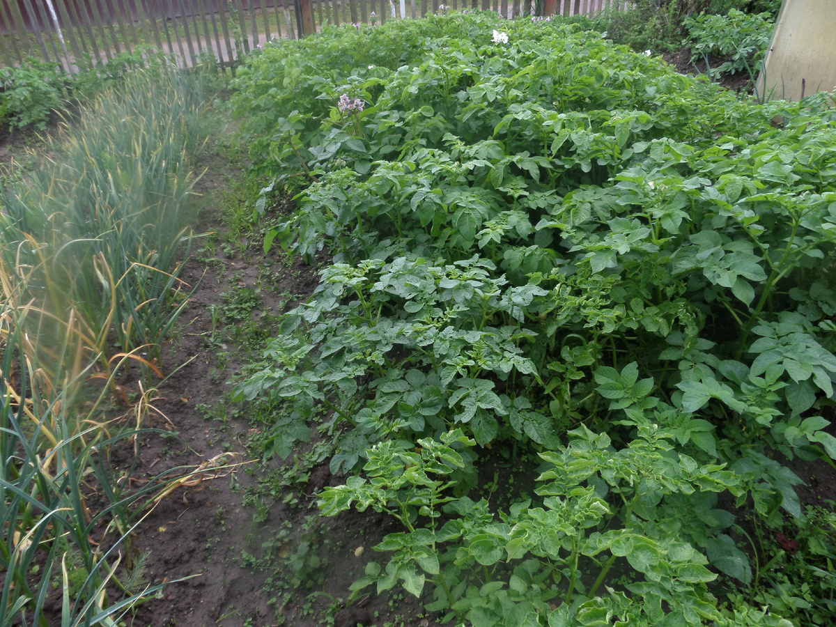 Сегодня хочу вернуться к теме, о которой уже писал в прошлом году. Обман производителей по сортам огородных культур. Если вы купили пакетик семян, не значит, что вырастет именно то. Я понимаю, продавцы, как правило не при чем. Все дело в недобросовестных производителях либо мошенниках. Но нам от этого не легче. В прошлом году почти половина растений оказалась не того сорта, что указан на упаковке. Салат не кочанный, а простой, томаты красные, а не желтые, фасоль не спаржевая и так далее. В этом году несоответствие достигло почти ста процентов. Сейчас покажу только некоторые культуры. Прошу строго не судить за сорняки, месяц дожди – не успеваю все полоть вовремя. Картофель Не для кого не секрет, что посади картофеля, занимают основное место у большинства огородников. Поэтому к выбору сорта подходят наиболее ответственно. Что посеешь то и пожнешь. Вот только современные сорта недолговечны – суперэлита, элита, 1,2,3,4 категории и все. Дальше только обновлять. А где взять? Естественно, в с