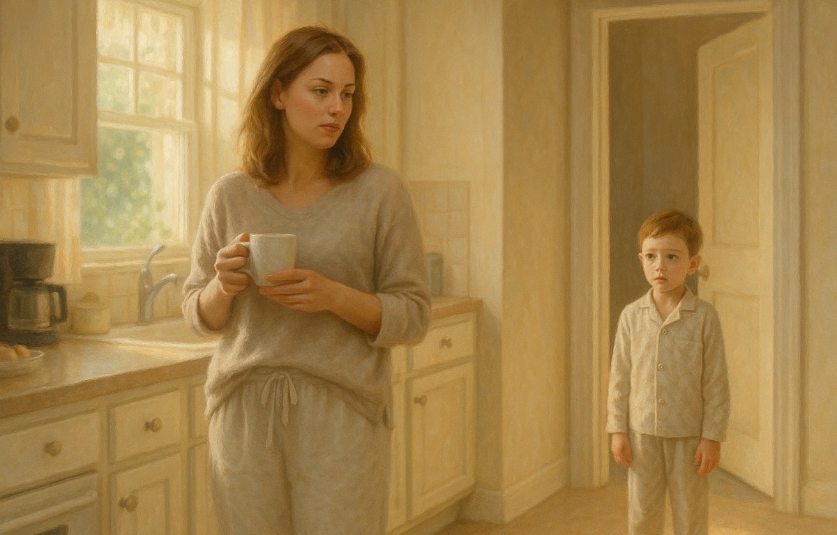 Блинчики готовы. Они едят за столом, и Елена замечает: сын не просто завтракает. Он наблюдает за ней. Изучает каждое движение, каждую эмоцию на лице.
